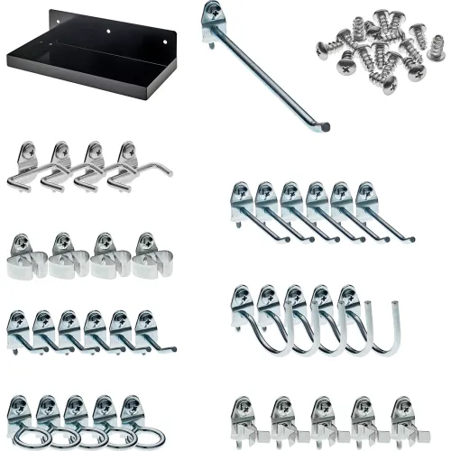 Durahook® Locking Steel Pegboard Shelf w/ 36 Assorted Hooks, 12"W x 6"D, Black