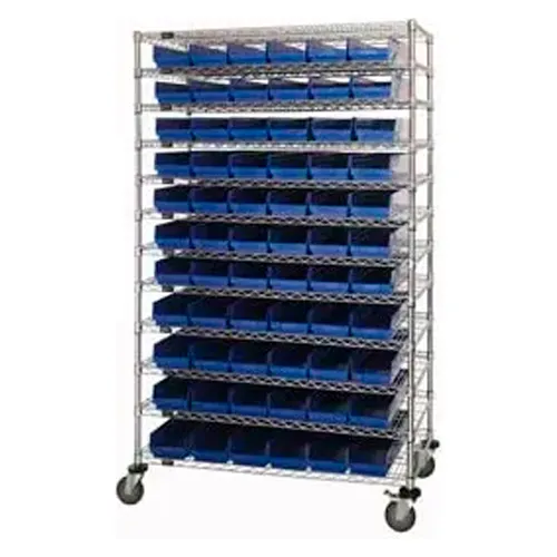 Global Industrial Chrome Wire Shelving with 66 4"H Plastic Shelf Bins Blue, 48x14x74