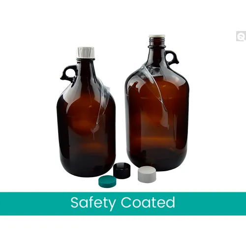 Qorpak® 135oz Safety Coated Amber Jug w/38-439 Black Phenolic F217 & PTFE Cap, Vacuum, 6PK