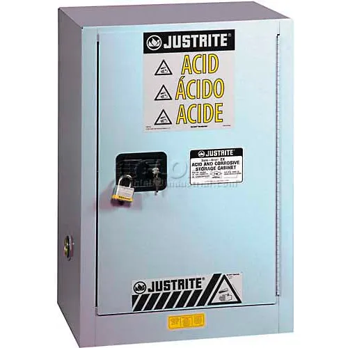 Justrite 15 Gal. Acid Cabinet, Right Hinge, Manual Close, 1 Door, 24"W x 21-5/8"D x 35-3/4"H, Silver