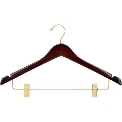 17" Wood Hanger for Ladies' Suit/Skirt, Standard Hook, Walnut w/ Brass Hardware, 100/Case
