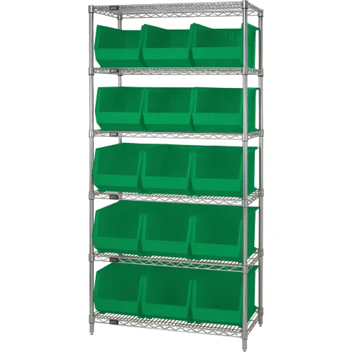 Quantum WR6-260 Chrome Wire Shelving With 15 Giant Plastic Stacking Bins Green, 36x18x74