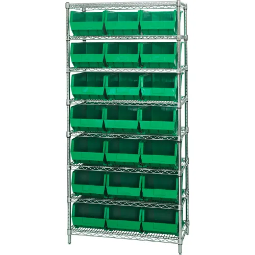 Quantum WR8-255 Chrome Wire Shelving With 21 Giant Plastic Stacking Bins Green, 36x18x74