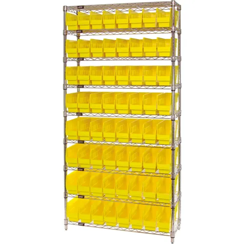Quantum WR9-203 Chrome Wire Shelving with 64 6"H Plastic Shelf Bins Yellow, 36x18x74