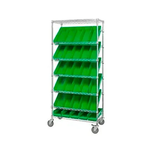 Global Industrial Easy Access Slant Shelf Chrome Wire Cart 18 4"H Shelf Bins Green 36Lx18Wx74H