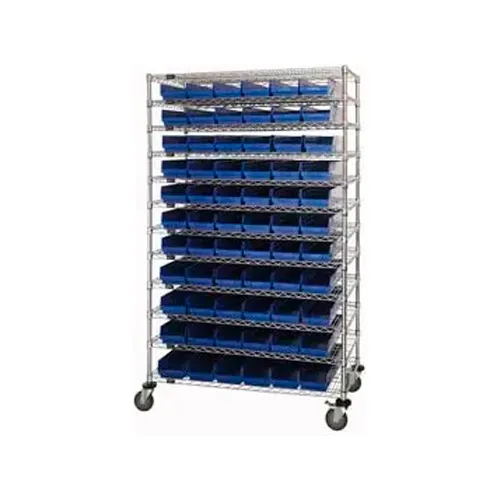 Global Industrial Chrome Wire Shelving with 66 4"H Plastic Shelf Bins Blue, 48x18x74