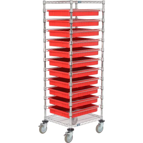 Global Industrial Chrome Wire Cart With (11) 3"H Red Grid Containers, 21x24x69