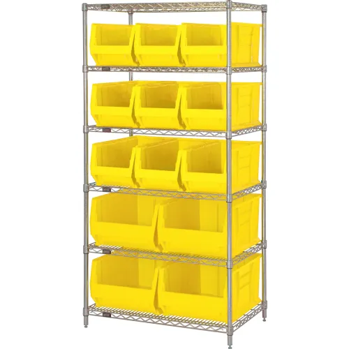 Quantum WR6-953954 Chrome wire Shelving With 13 24"D Hopper Bins Yellow, 24x36x74