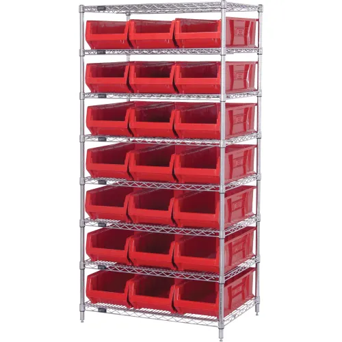 Quantum WR8-952 Chrome wire Shelving With 21 24"D Hopper Bins Red, 24x36x74