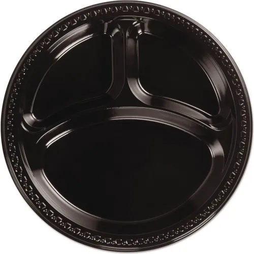 Chinet® 3-Compartment Heavyweight Plastic Plates, 10-1/4" Dia., Black, 125/Pack, 4 Packs/Carton
