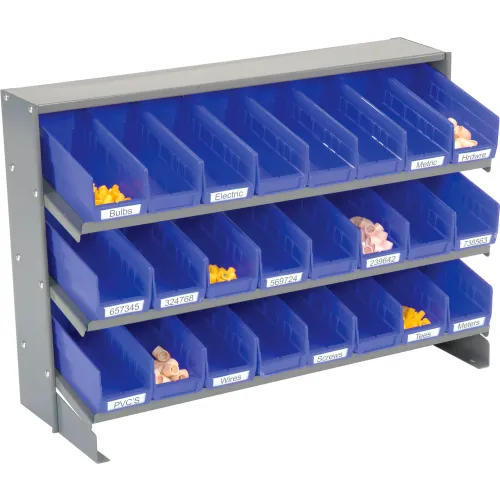 Global Industrial 3 Shelf Bench Pick Rack - 24 Blue Shelf Bins 4 Inch Wide 33x12x21