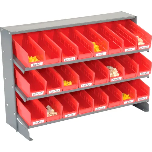 Global Industrial™ 3 Shelf Bench Pick Rack - 24 Red Plastic Shelf Bins 4 Inch Wide 33x12x21