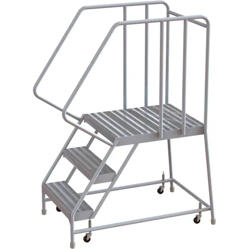 3 Step Aluminum Rolling Ladder, 24"W Ribbed Tread, 28"D Top Step, 32" Handrails - WLAR103244-D5
