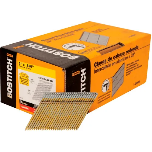 Bostitch 3" x .120 Ring Shank 28 Degree Wire Collated Full Round Head Stick Framing Nails, 2000/Qty