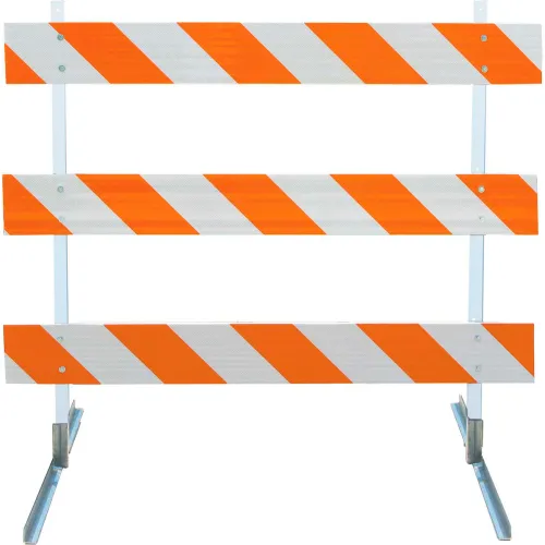 Plasticade Type III Barricade W/ Plastic Uprights & Angle Iron Feet, HIP Striped Sheeting, 96'' L