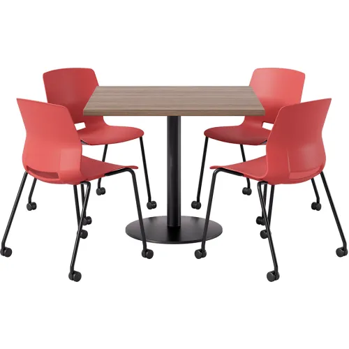 KFI 36" Square Table with 4 Imme Armless Caster Chairs, Coral Seat/Studio Teak Top