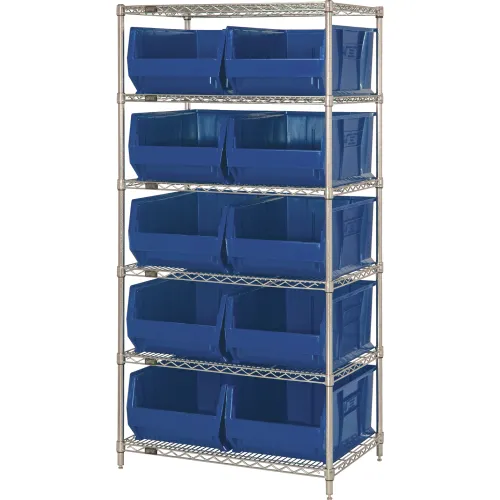Quantum WR6-954 Chrome Wire Shelving With 10 24"D Bins Blue, 36x24x74