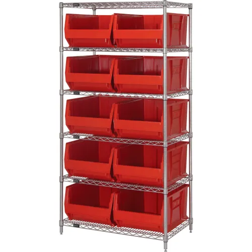 Quantum WR6-954 Chrome Wire Shelving With 10 24"D Bins Red, 36x24x74