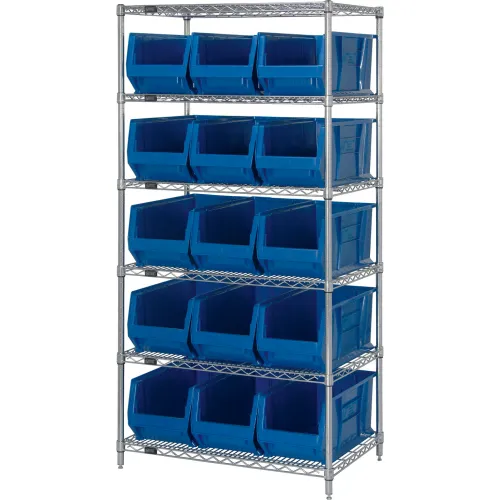 Quantum WR6-953 Chrome Wire Shelving With 15 24"D Bins Blue, 36x24x74