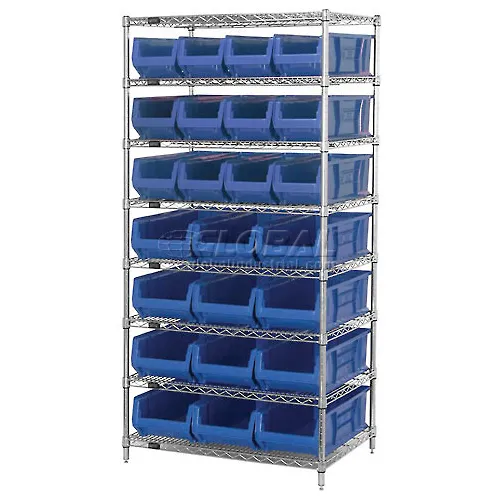 Quantum WR7-20-MIXBL Chrome Wire Shelving With 20 24"D Bins Blue, 36x24x74