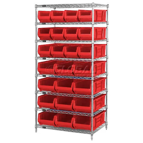 Quantum WR7-20-MIXRD Chrome Wire Shelving With 20 24"D Bins Red, 36x24x74