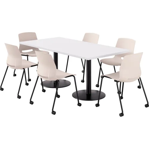 KFI 36" x 72" Table with 6 Imme Armless Caster Chairs, Moonbeam Seat/Designer White Top