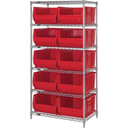 Quantum WR6-974RD Chrome Wire Shelving With 10 30"D Bins Red, 36x30x74