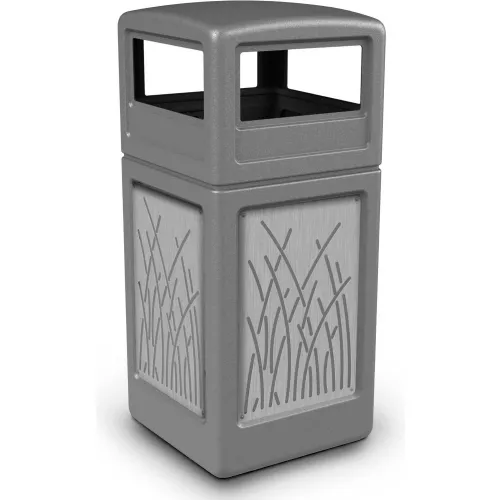 PolyTec Square Waste Container w/Dome Lid, Gray w/Reeds Stainless Steel Panels, 42-Gallon