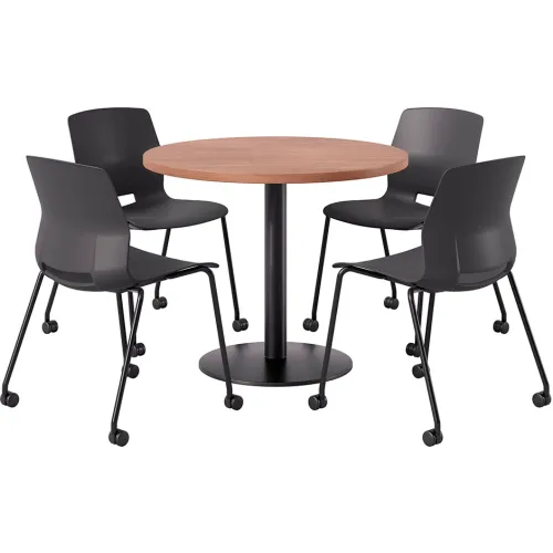 KFI 42" Round Table with 4 Imme Armless Caster Chairs, Black Seat/River Cherry Top