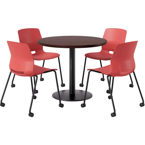 KFI 42" Round Table with 4 Imme Armless Caster Chairs, Coral Seat/Espresso Top