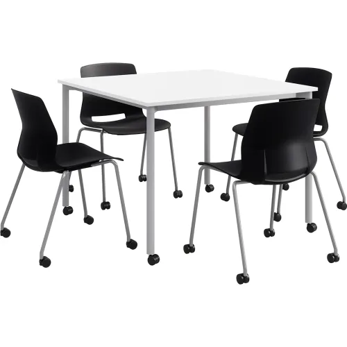 KFI 42" Square Table on Casters With 4 Chairs, Steel Frame White Table w/ Black Poly Chairs