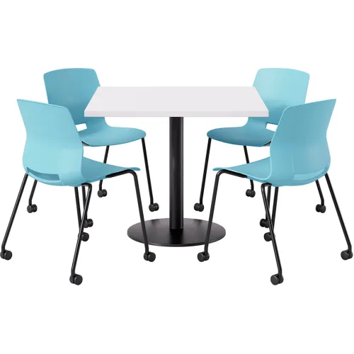 KFI 42" Square Table with 4 Imme Armless Caster Chairs, Sky Blue Seat/Designer White Top