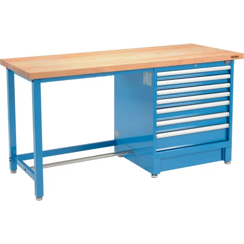 Global Industrial 72Wx30D Modular Workbench, 7 Drawers, Maple Butcher Block Square Edge, Blue