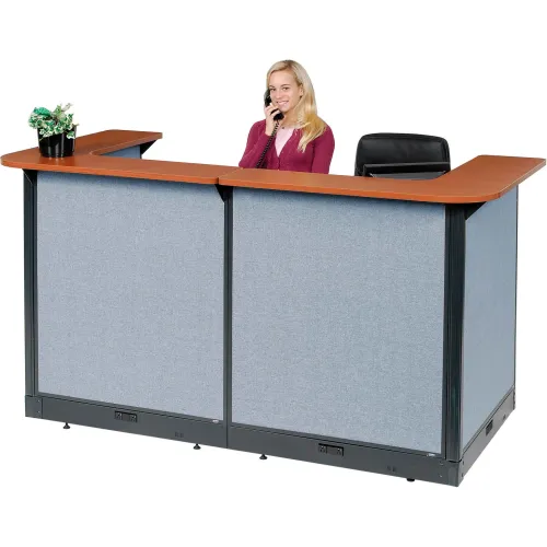Interion® U-Shaped Electric Reception Station, 88"W x 44"D x 46"H, Cherry Counter, Blue Panel