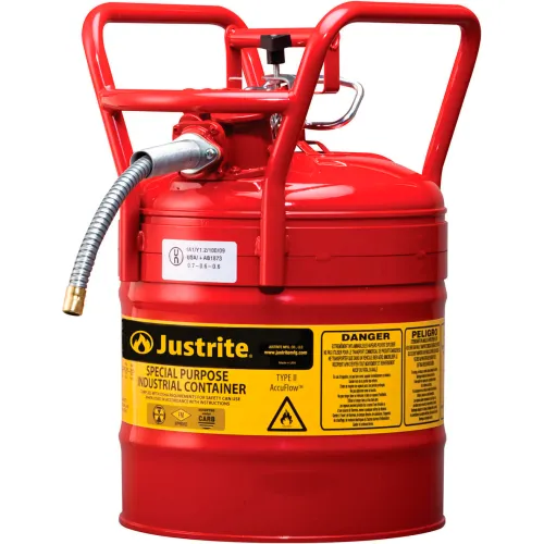 Justrite Accuflow DOT Transport Safety Can For Flammable Liquids, 5/8" Metal Hose, 5 Gal. Cap., Red