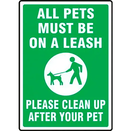 AccuformNMC All Pets Must Be On A Leash Please Clean Up After Your Sign, Aluminum, 18" x 12", Green