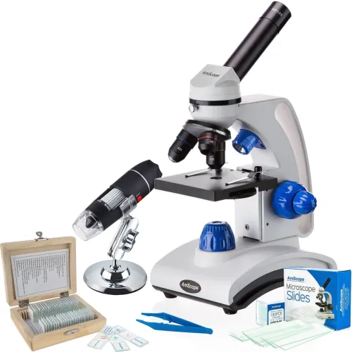 AmScope 40X-1000X Monocular Microscope, 25-pc Slide Set, Tweezers Plus USB Digital Microscope