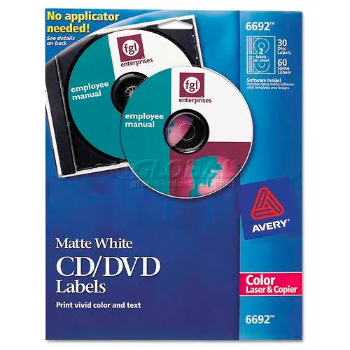 Avery 6692 Laser CD/DVD Labels, Matte White, 30/Pack