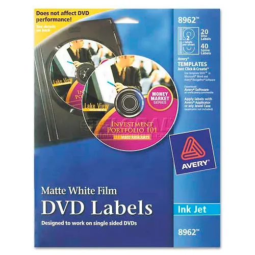 Avery 8962 Inkjet DVD Labels, Matte White, 20/Pack