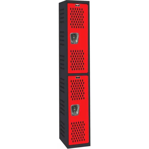 Hallowell® 2-Tier 2 Door Gym/PE Ventilated Locker, 12"W x 18"D x 72"H, Black/Red, Assembled