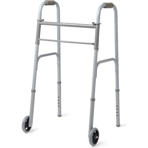 Medline Basic Two Button Folding Walker w/ 5" Casters, Silver, 4 Pack