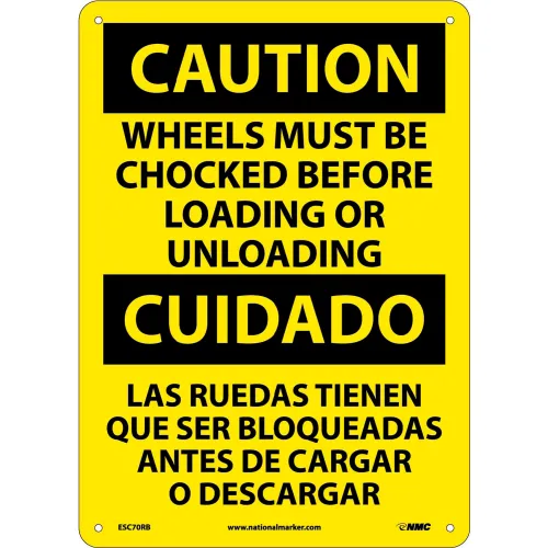 NMC Bilingual Plastic Sign, Wheels Must Be Chocked Before Loading Unloading, 10"W x 14"H