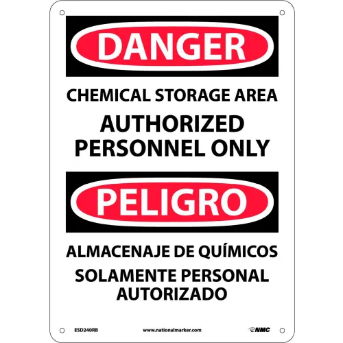 NMC Bilingual Plastic Sign, Chemical Storage Area Authorized Personnel Only, 10"W x 14"H