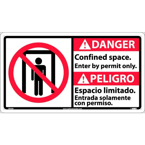 NMC Bilingual Plastic Sign, Danger Confined Space Enter By Permit Only, 18"W x 10"H