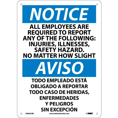 NMC Bilingual Plastic Sign, Notice All Employees Are Required To Report, 10"W x 14"H