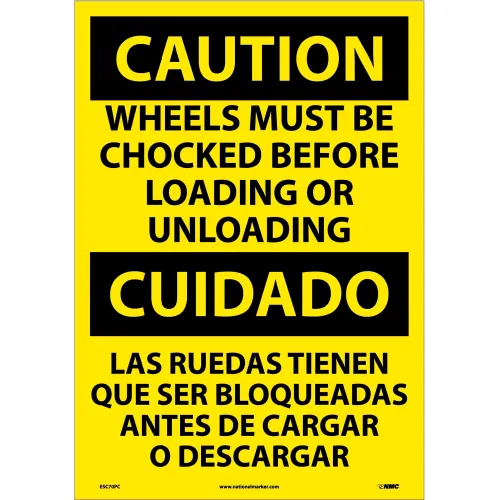 Bilingual Vinyl Sign - Caution Wheels Must Be Chocked Before Loading Unloading