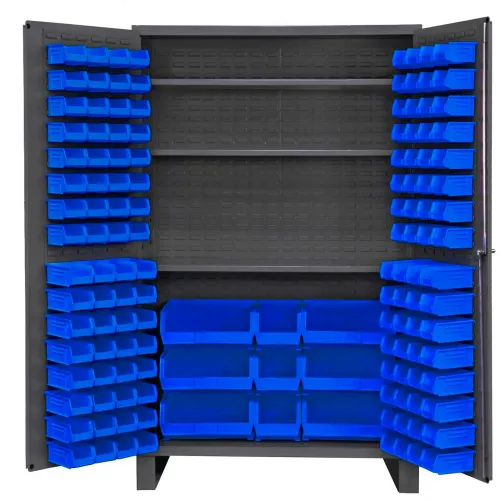 Global Industrial Bin Cabinet Flush Door - 137 Blue Bins, 16 Ga. All-Welded Cabinet 48x24x78