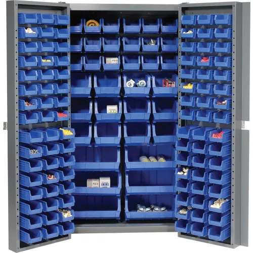 Global Industrial Deep Door Bin Cabinet, 132 Blue Bins, Assembled Cabinet 38"W x 24"D x 72"H