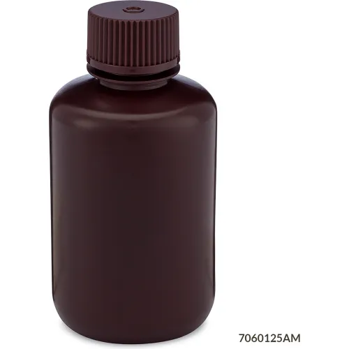 Bottle, Narrow Mouth, HDPE, Attached Polypropylene Screw Cap, Amber, 125mL, 12/Pack