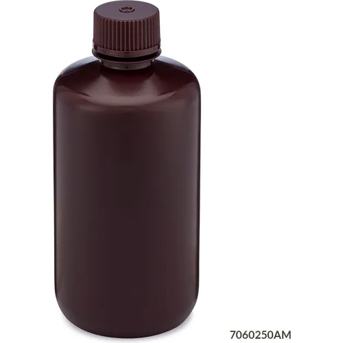 Bottle, Narrow Mouth, HDPE, Attached Polypropylene Screw Cap, Amber, 250mL, 12/Pack